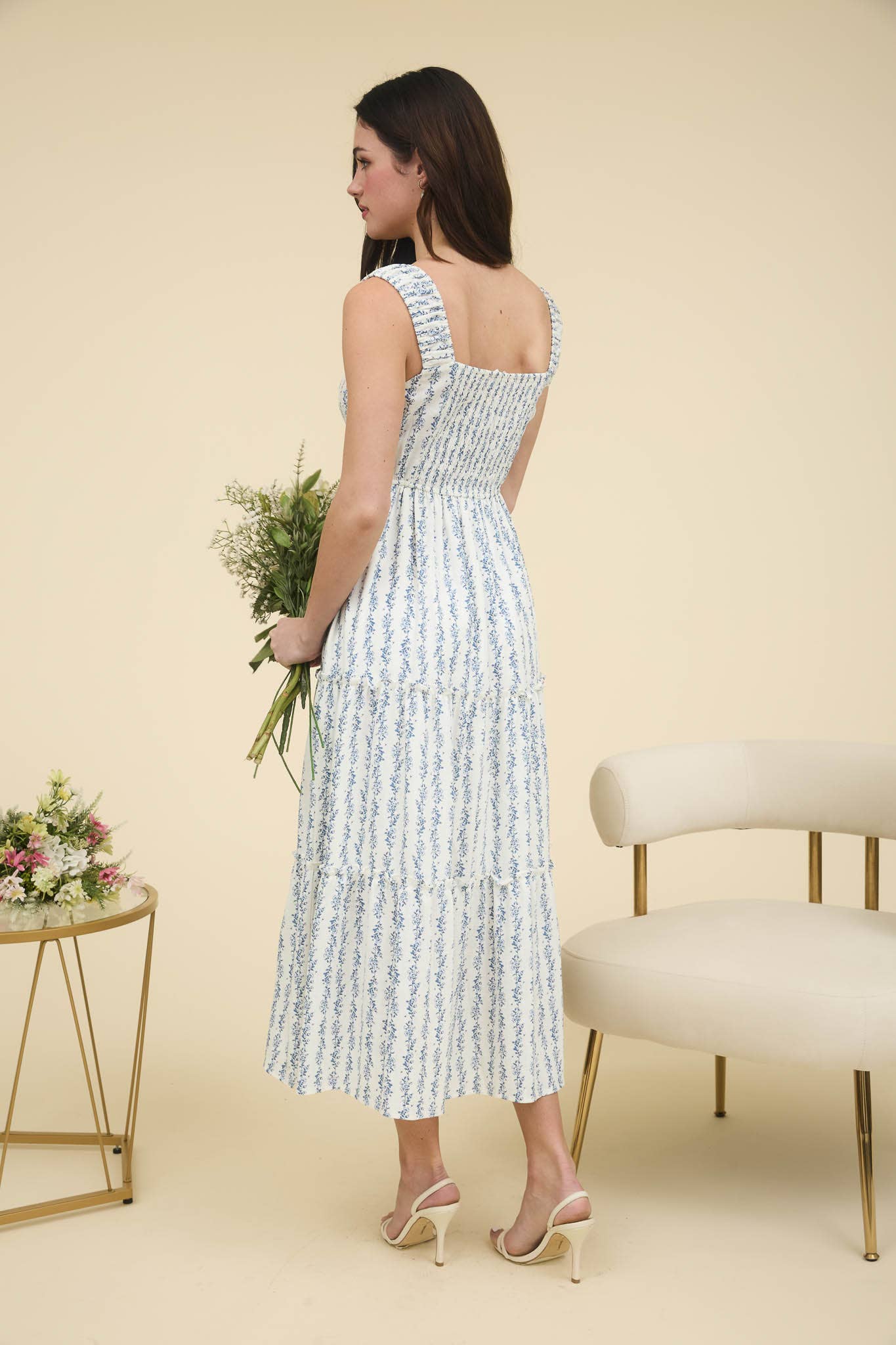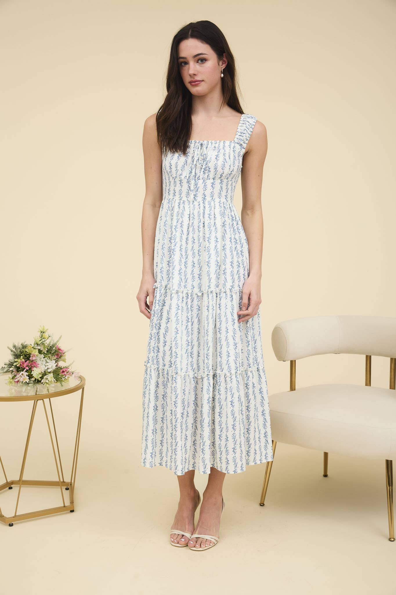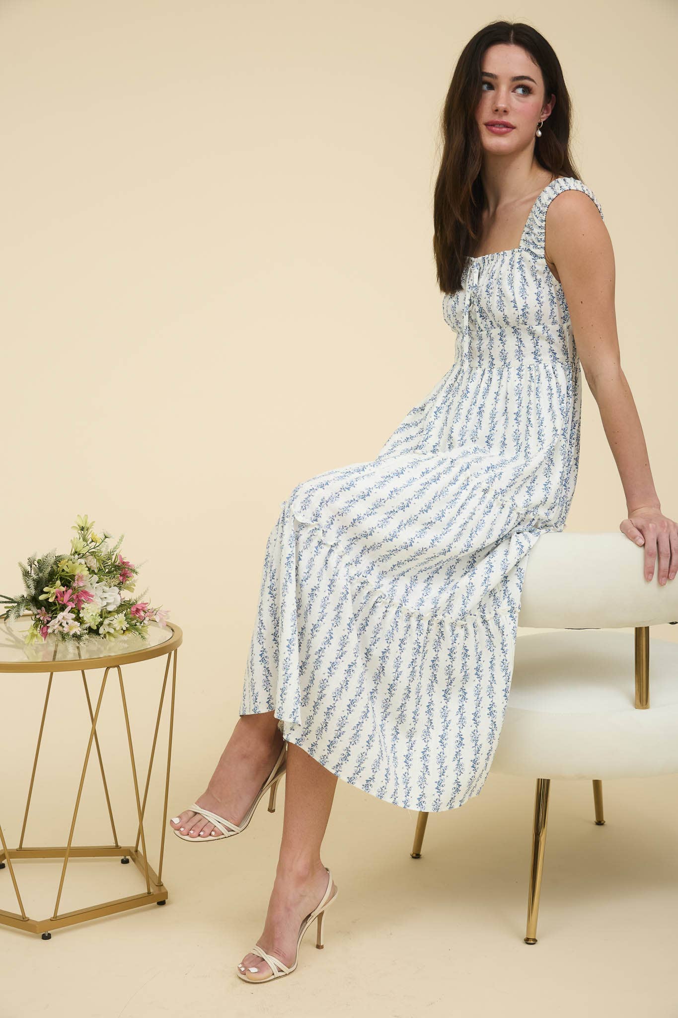 SQUARE NECKLINE WIDE ELASTIC STRAP FRONT TIE RUFFLE DETAIL BACK SMOCKING STRIPE FLORAL PATTERN LINED MIDI DRESS SHELL:88%RAYON,12%LINEN LINING:95%POLYESTER, 5%SPANDEX