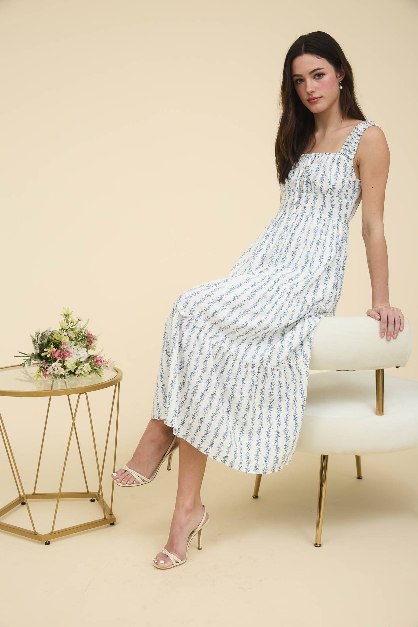 FLORAL STRIPE RUFFLE DETAIL MAXI DRESS: BLUE MULTI