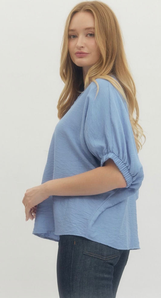 ACID WASHED TAB SLEEVE BACK BUTTON KNIT TOP