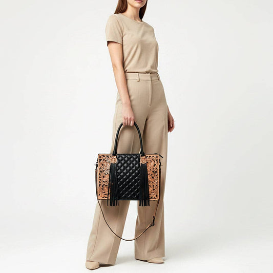 Cowhide & Hand-Tooled Leather Tote | Fringe Shoulder Bag