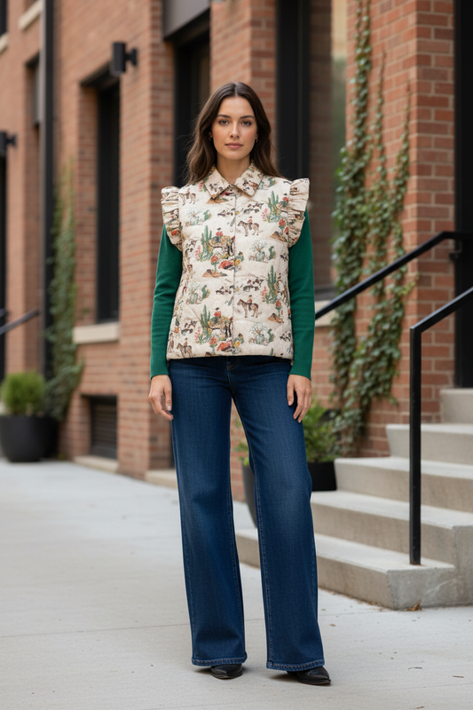 TAUPE WAGON WHEEL RUFFLE VEST