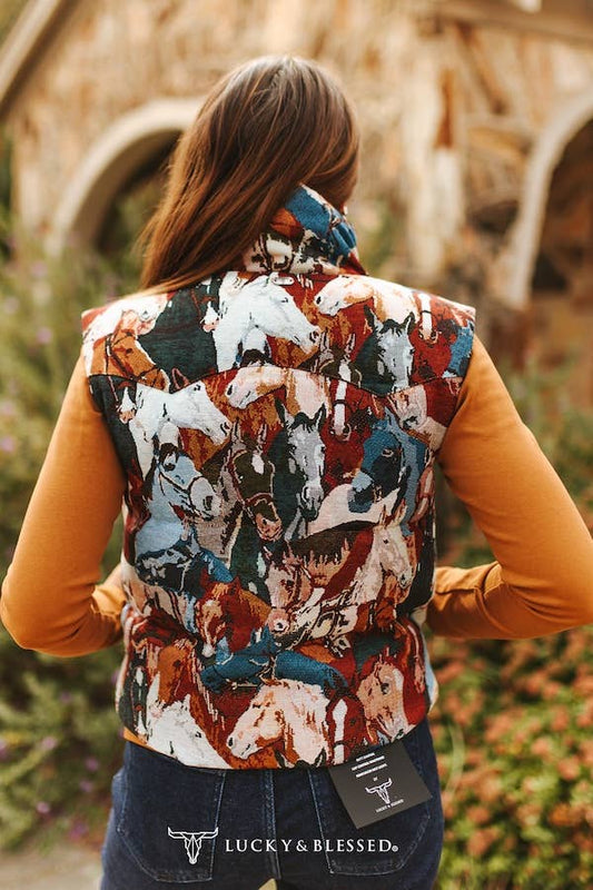 Jacquard Woven Red Horses Zip-Up Sleeveless Puffer Jacket