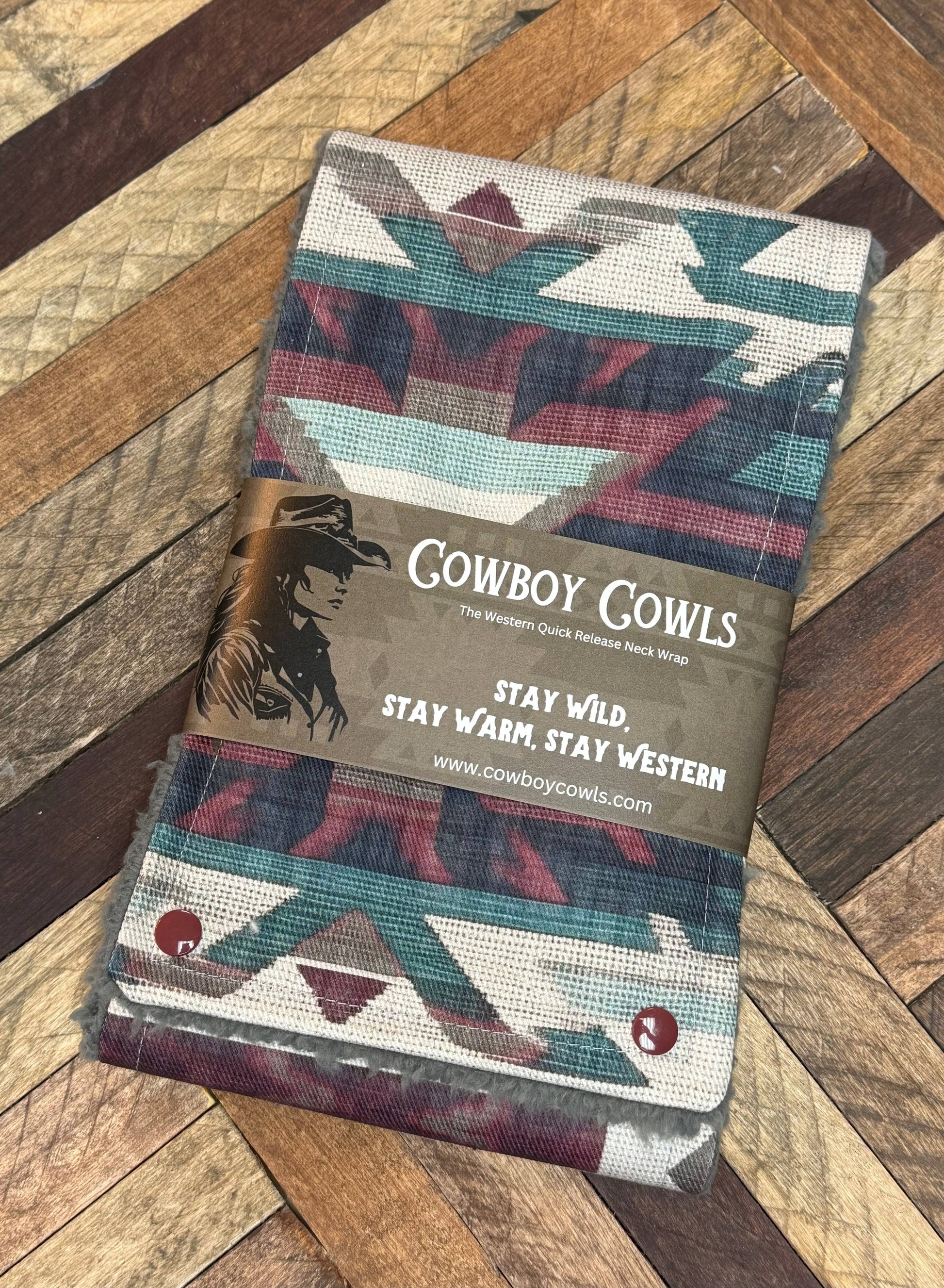Introducing our Custom Designed Linda Cowboy Cowl - features a durable denim exterior showcasing a striking southwestern pattern of deep burgundy, teal, cream, and charcoal tones. Every color stands out against the denim base, making Linda both eye-catching and authentically ranch-ready.