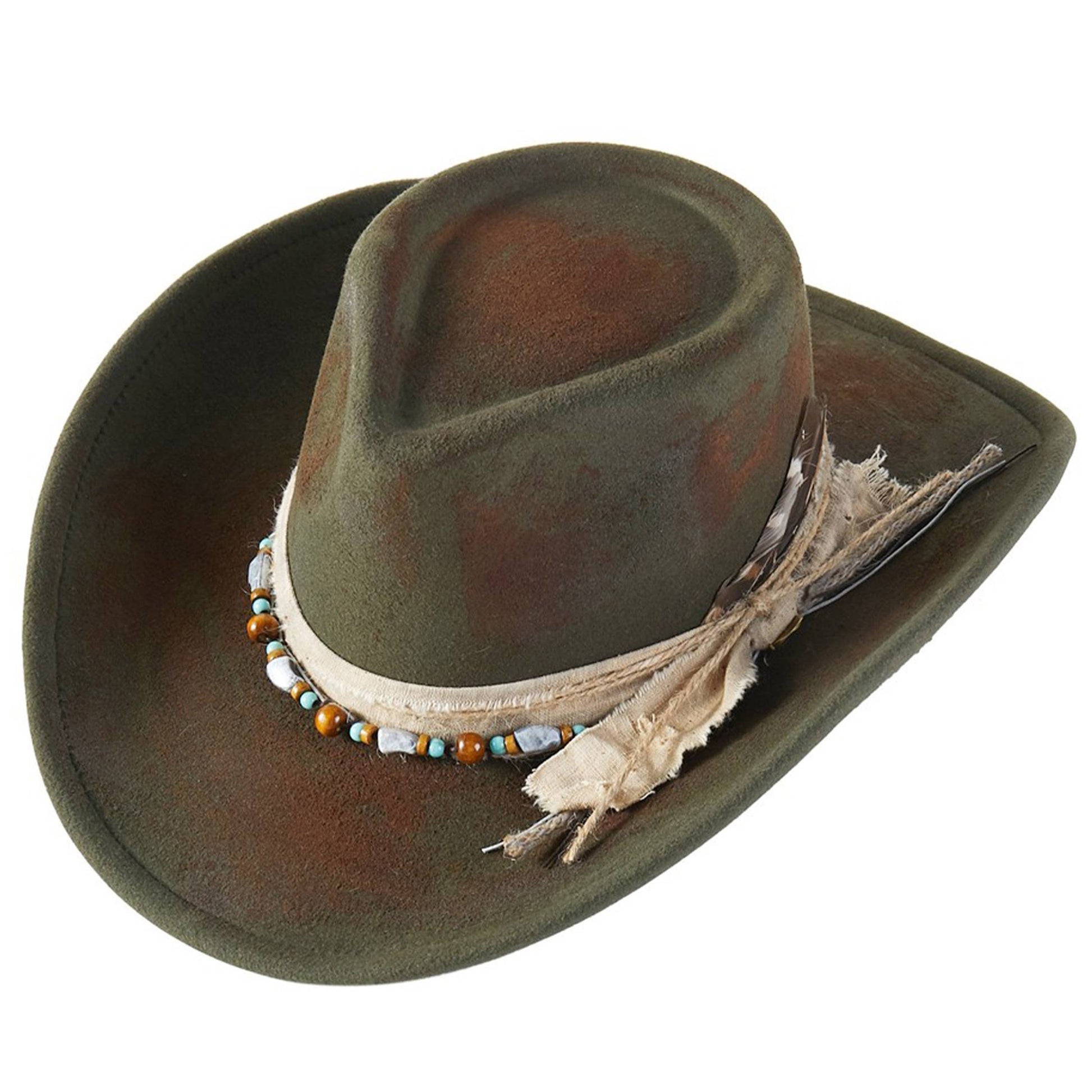 Rustic Vintage Style Cowgirl Cowboy Fedora Hat with Distressed Fabric, Beads, Ribbon, and Feather